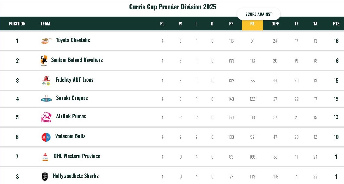 Griquas and the Lions each have 15 points and three wins to their credit – the same number of victories as the Cheetahs and Boland. The top four are followed by the Pumas (13 points), Bulls (10 points), and WP and the Sharks XV, who both have a single point and are still winless after four rounds.