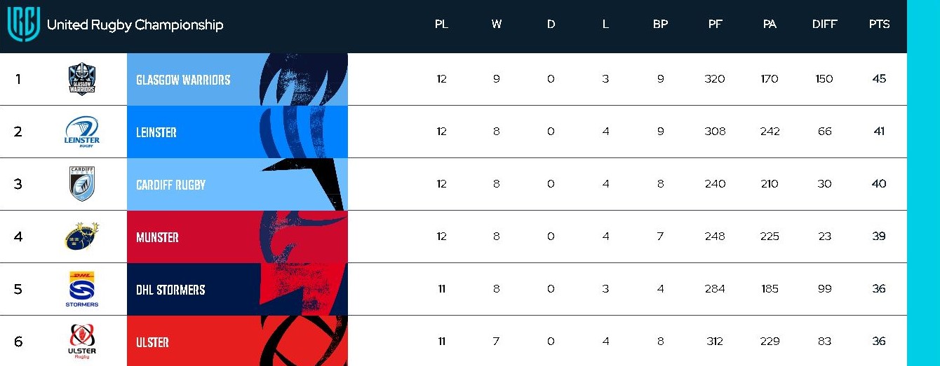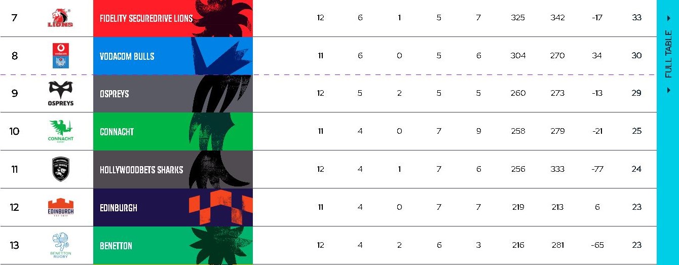 The seventh-placed Fidelity Securedrive Lions, meanwhile, trail them by only three points (33 pts), while the Vodacom Bulls are in eighth place (30 pts), and the Hollywoodbets Sharks in 11th position (24 pts).