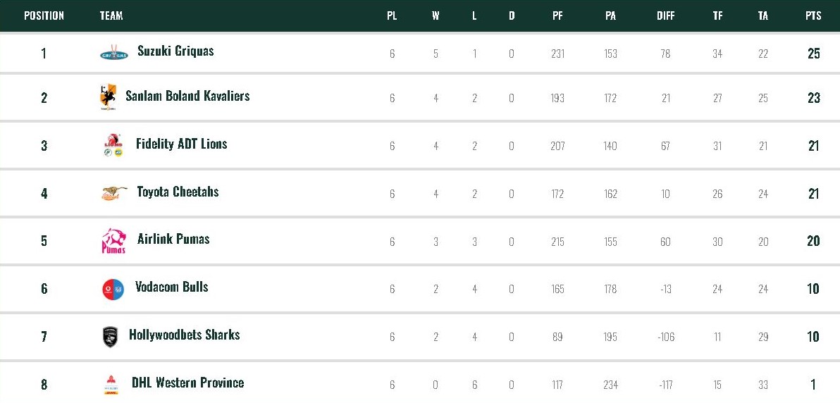 They are followed by surprise package Kavaliers, who have two points less (23 points). The side from Wellington gained two crucial points from their heartbreaking loss, but they are just two points above the third-placed Lions and fourth-placed Cheetahs (both 21 points).