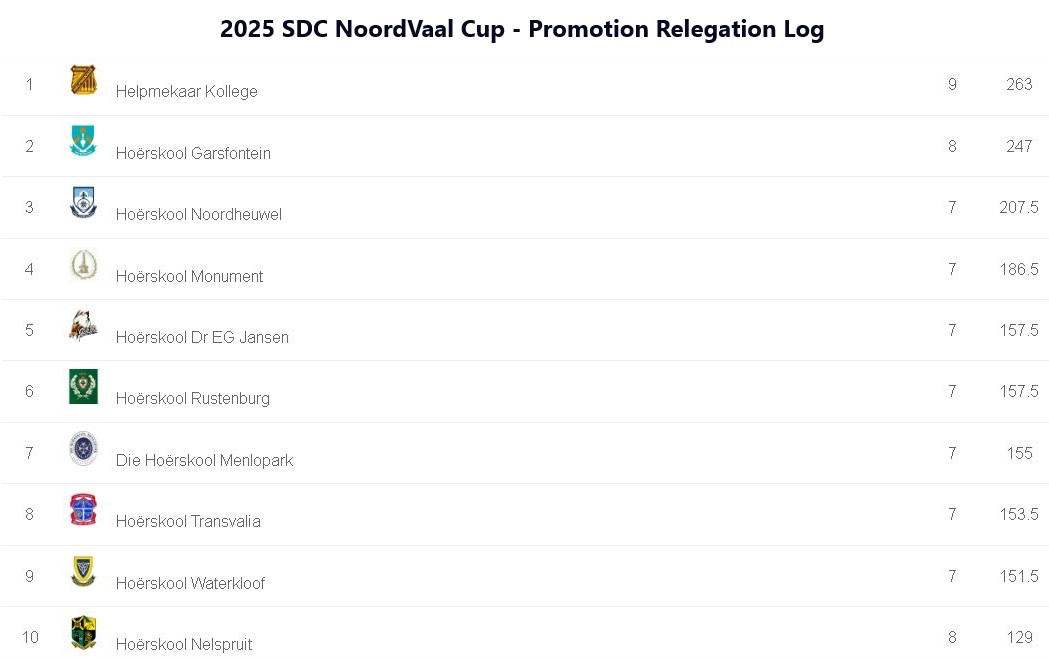 At the end of 2025, two schools in the NoordVaal Cup will be automatically relegated and one school promoted from the Plate. This will reduce the Cup Division to nine schools. At this stage, Middelburg HTS, Middelburg and Wesvalia are leading the log in the Plate Division.